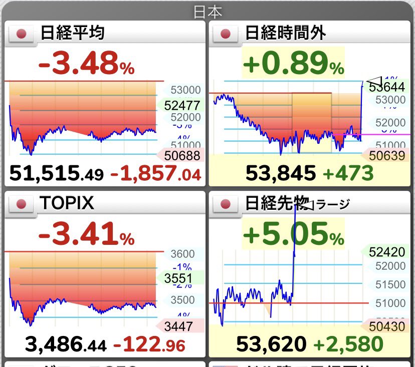 | … | 7無念Nameとしあき26/03/23(月)20:34:34No.1395897134そうだねx10日経先物が一気に+2000とか跳ね上がった |