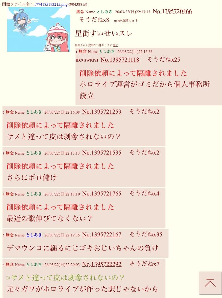 | … | 43無念Nameとしあき26/03/24(火)00:04:06No.1395950467そうだねx3>VTuber粘着してるって連れオナが粘着自白してたよね |
