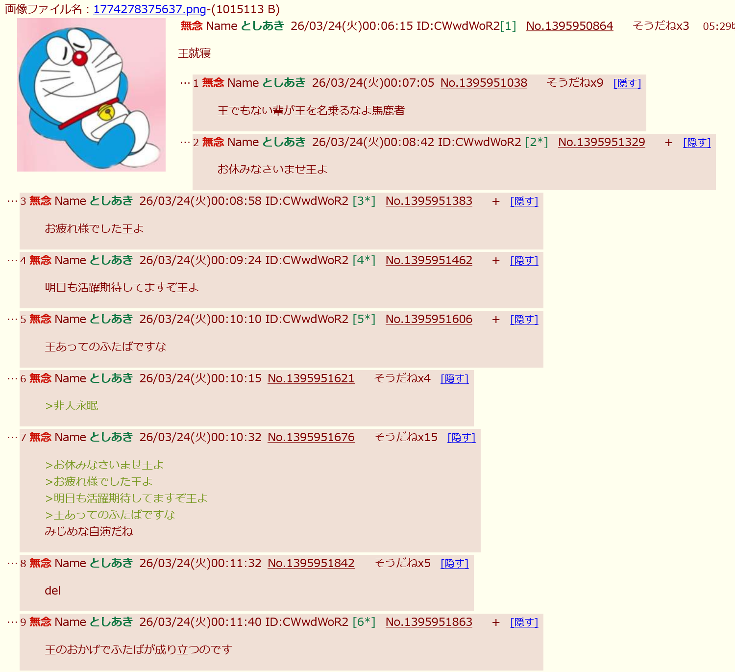 | … | 41無念Nameとしあき26/03/24(火)00:39:42No.1395956326そうだねx2自分を王だと思い込んでる精神異常者のガイジが立てたスレdel |