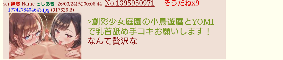 | … | 95無念Nameとしあき26/03/24(火)02:16:26No.1395965597+>No.1395965353 |