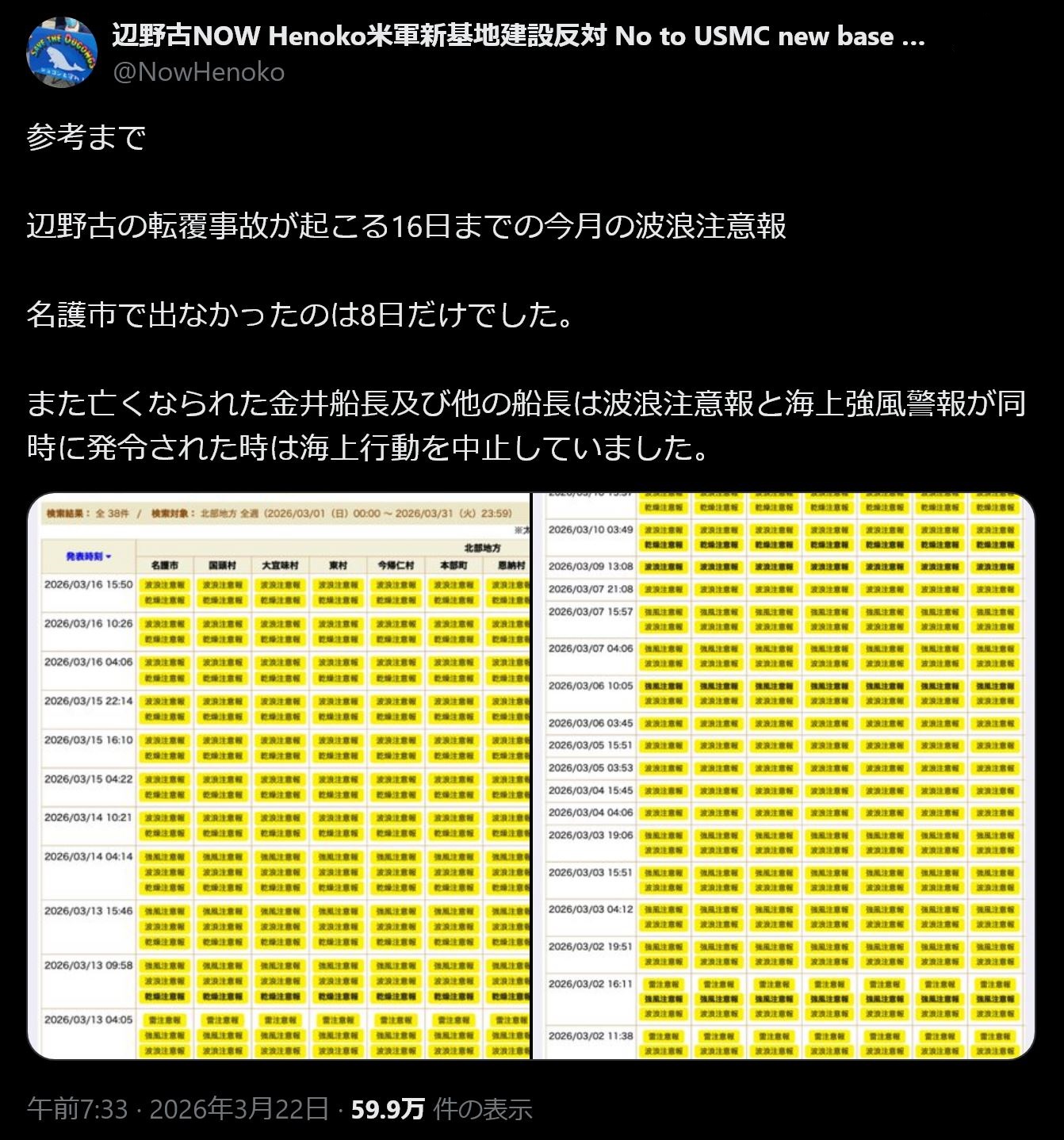 | … | 988無念Nameとしあき26/03/24(火)11:49:02No.1396002673+>波浪警報は抗議活動をさせない為の陰謀だ!って意識だったんじゃね? |