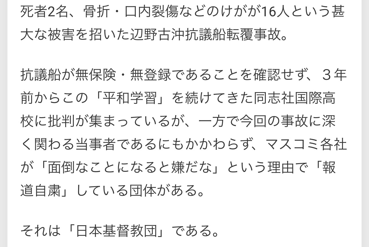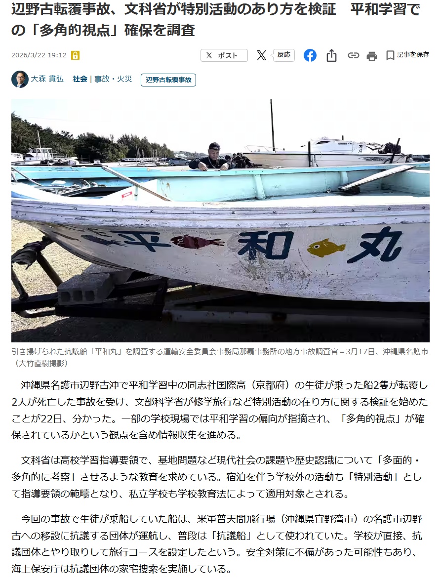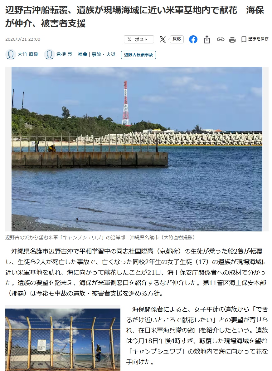 | … | 905無念Nameとしあき26/03/24(火)11:35:50No.1396001060そうだねx5 1774319750265.jpg-(296831 B) 沖縄県名護市辺野古沖で平和学習中の同志社国際高(京都府)の生徒が乗った船2隻が転覆し、 |