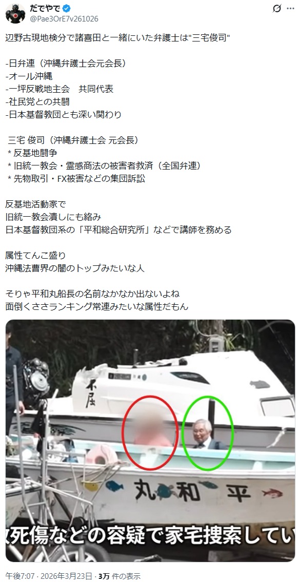 | … | 909無念Nameとしあき26/03/24(火)11:36:35No.1396001154+>沖縄の地元青年団が反基地とかの団体監視して追い出そうとしてる |
