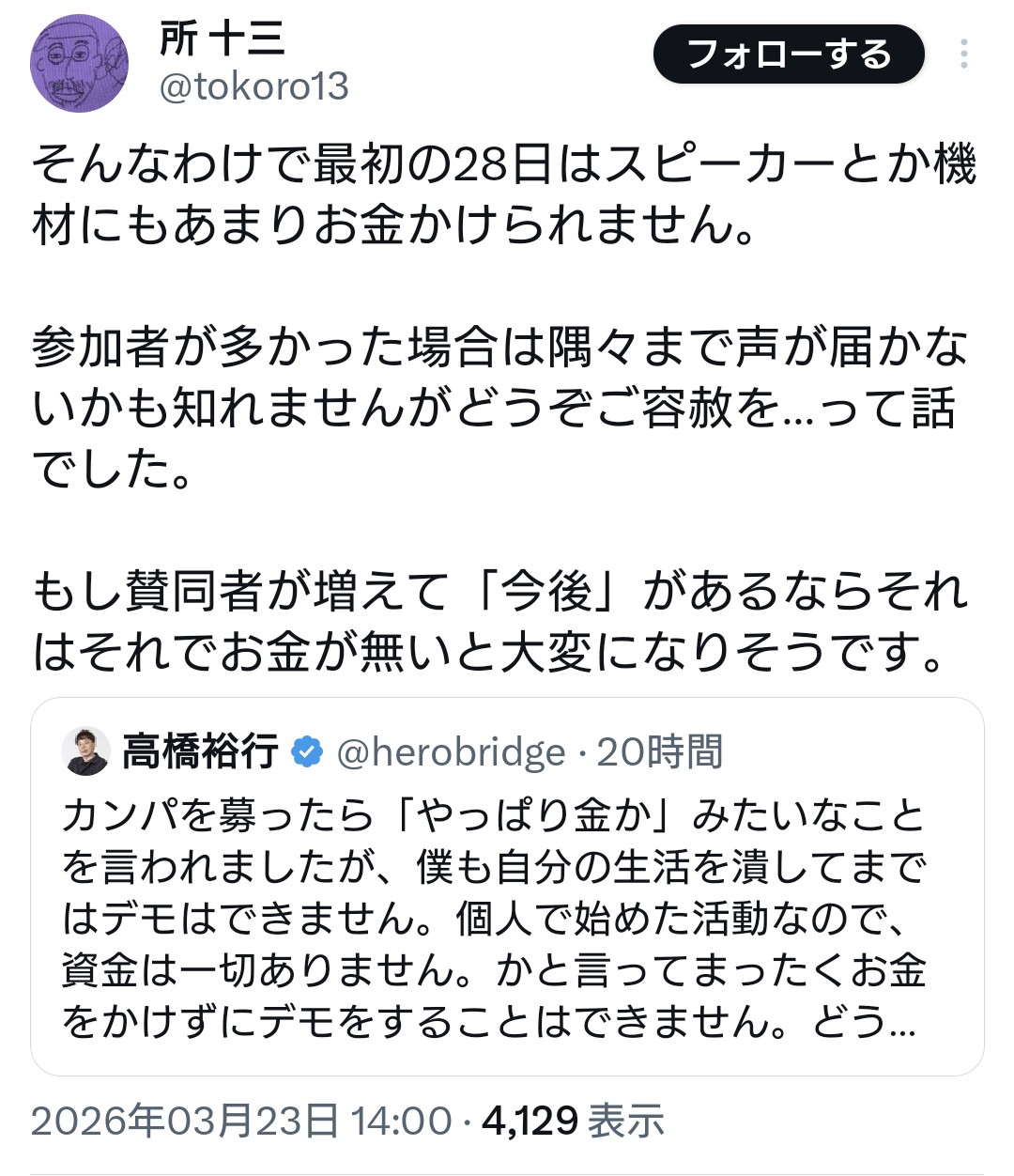 | … | 18無念Nameとしあき26/03/24(火)07:07:17No.1395974787そうだねx10>「デモ行進して問題提起したいけど資金が無い」って活動家がいろいろあった末に |