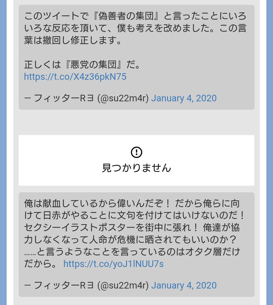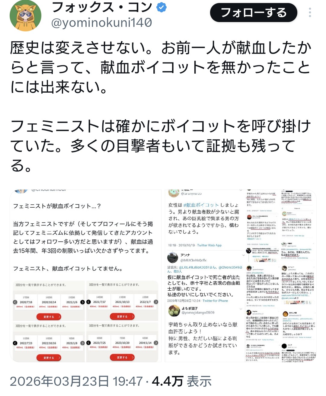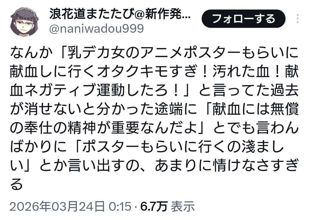 | … | 13無念Nameとしあき26/03/24(火)06:57:12No.1395974163そうだねx41 1774303032542.jpg-(293463 B) デモに賛同してるオタク達は献血ボイコットなんて存在しないとか歴史修正始めてるからよ |