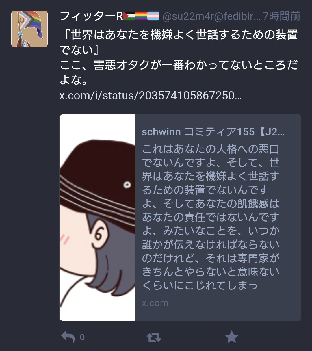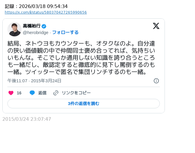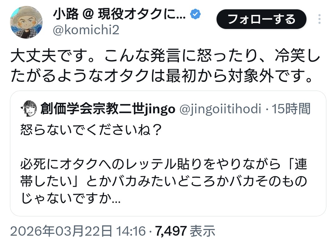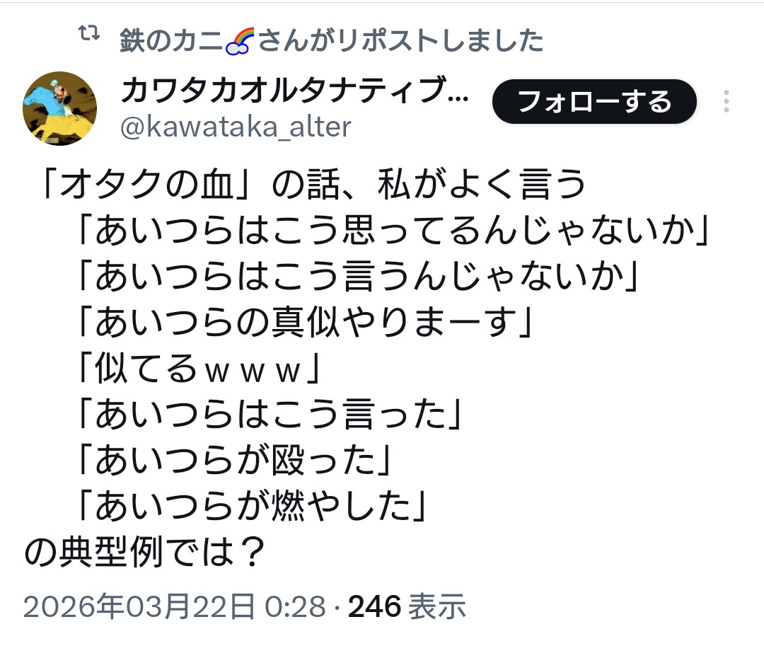 | … | 951無念Nameとしあき26/03/24(火)12:23:19No.1396007535+>オタクって横の連帯は好きだけど上から目線で味方ヅラされるのを嫌悪するからね |
