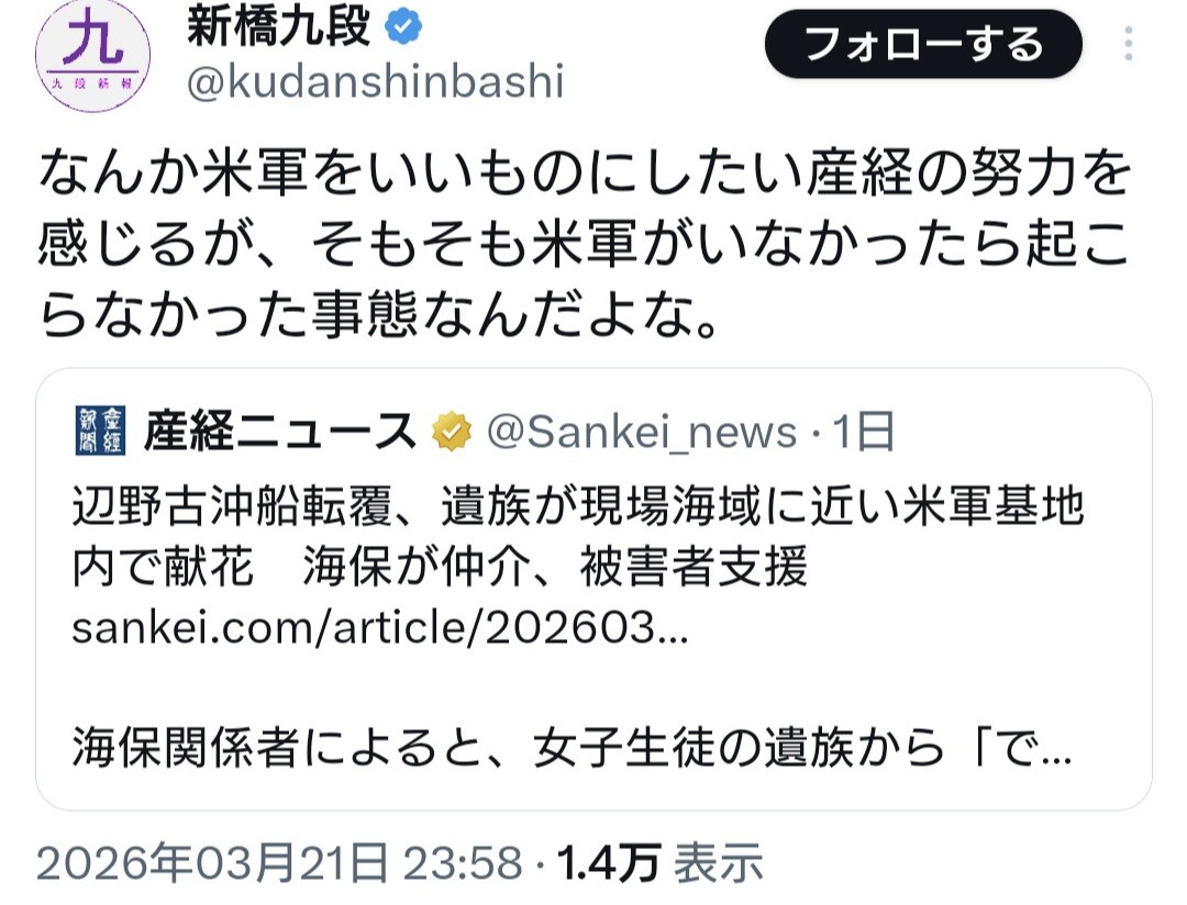 | … | 924無念Nameとしあき26/03/24(火)12:15:11No.1396006131+絶対反戦関係ないプラカードが並ぶことになるだろうな |