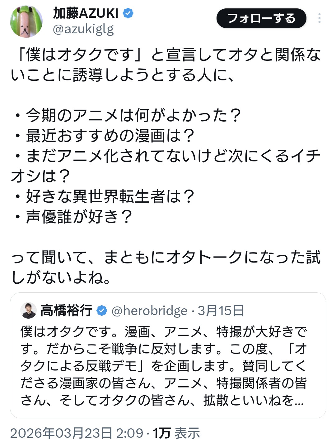 | … | 912無念Nameとしあき26/03/24(火)12:10:49No.1396005431そうだねx2パヨク「オタク反戦デモにネトウヨはお呼びじゃねえんだよ!!!」 |