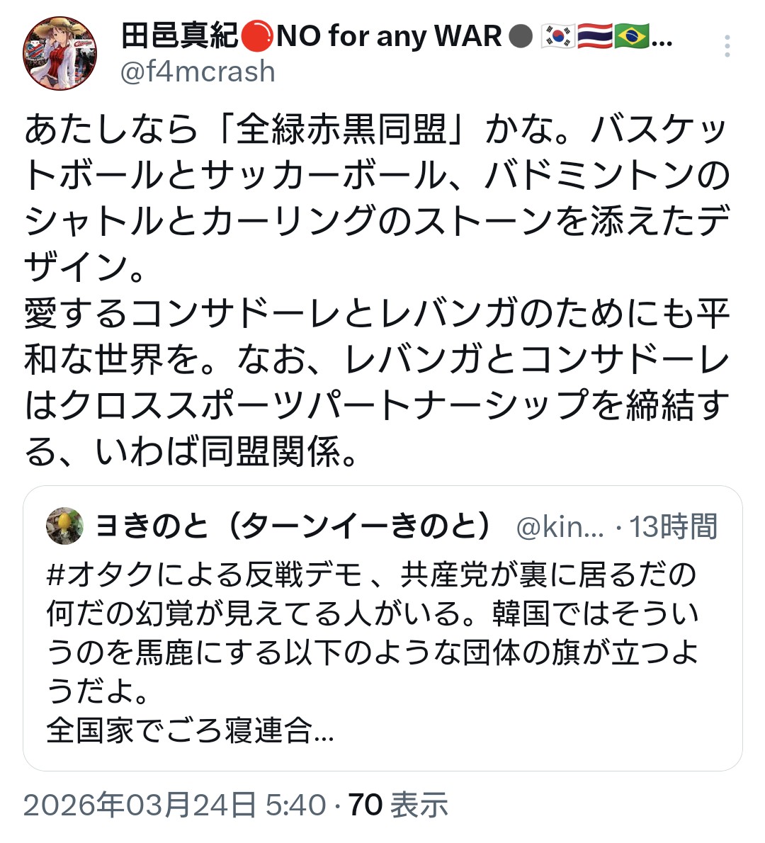 | … | 89無念Nameとしあき26/03/24(火)07:53:13No.1395978295+ 1774306393496.jpg-(236126 B) コンサドーレ札幌を反戦デモのネタに使おうとするサポーター |
