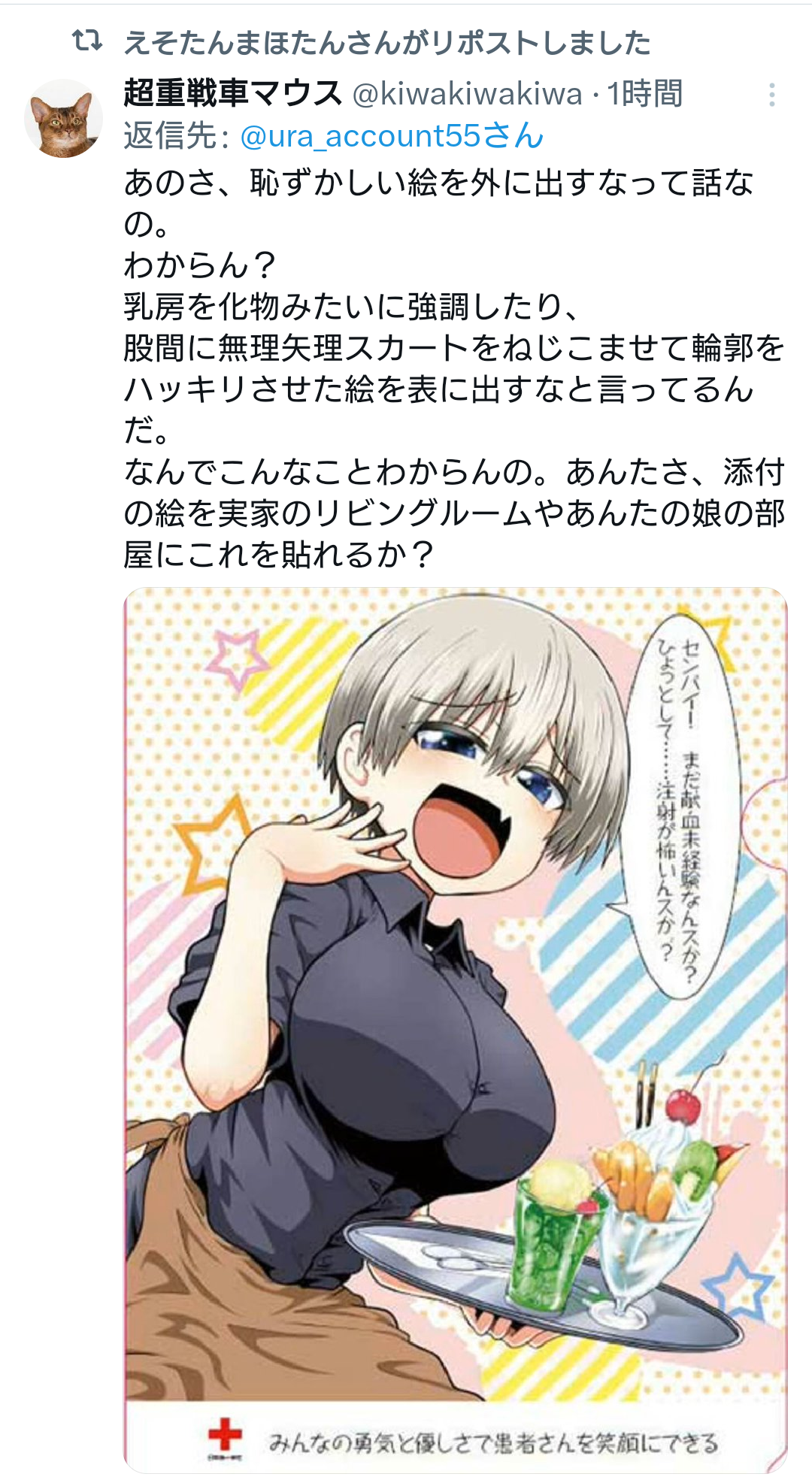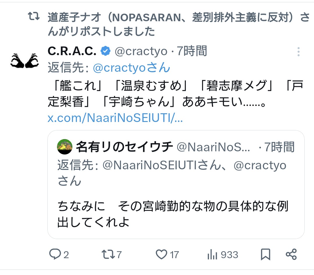| … | 967無念Nameとしあき26/03/24(火)12:27:30No.1396008328+>>涙目で消した後に自衛隊もアニメキャラポスター出してるだろ! そっちにも噛みつけよ!と喚く |