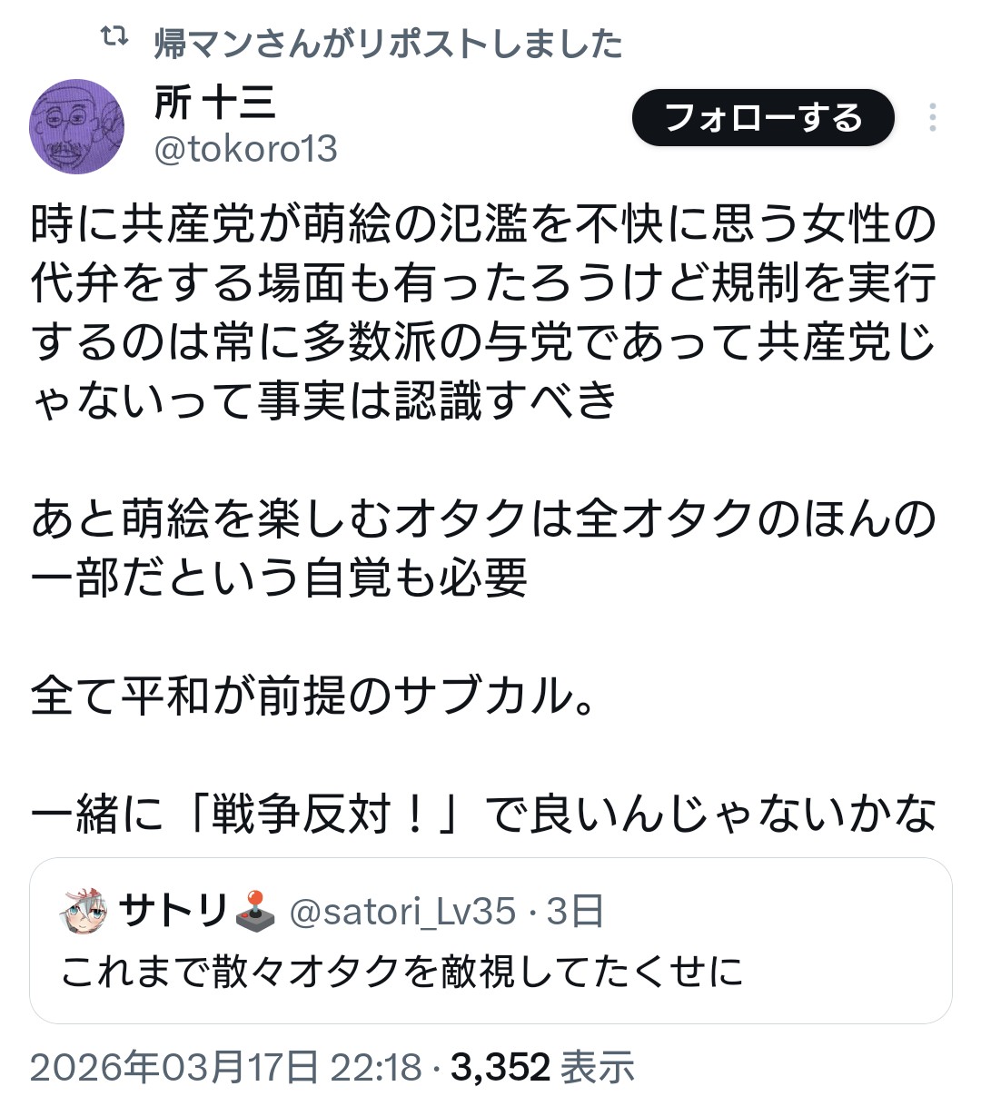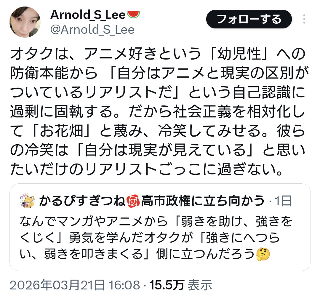 | … | 943無念Nameとしあき26/03/24(火)12:21:35No.1396007235+>本来的にはオタクは本当の自由革新思想には近い人多いはずなんだけど |