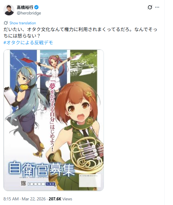 | … | 945無念Nameとしあき26/03/24(火)12:21:59No.1396007317+自衛隊のポスターにはガンダムも初音ミクもいないだろ |