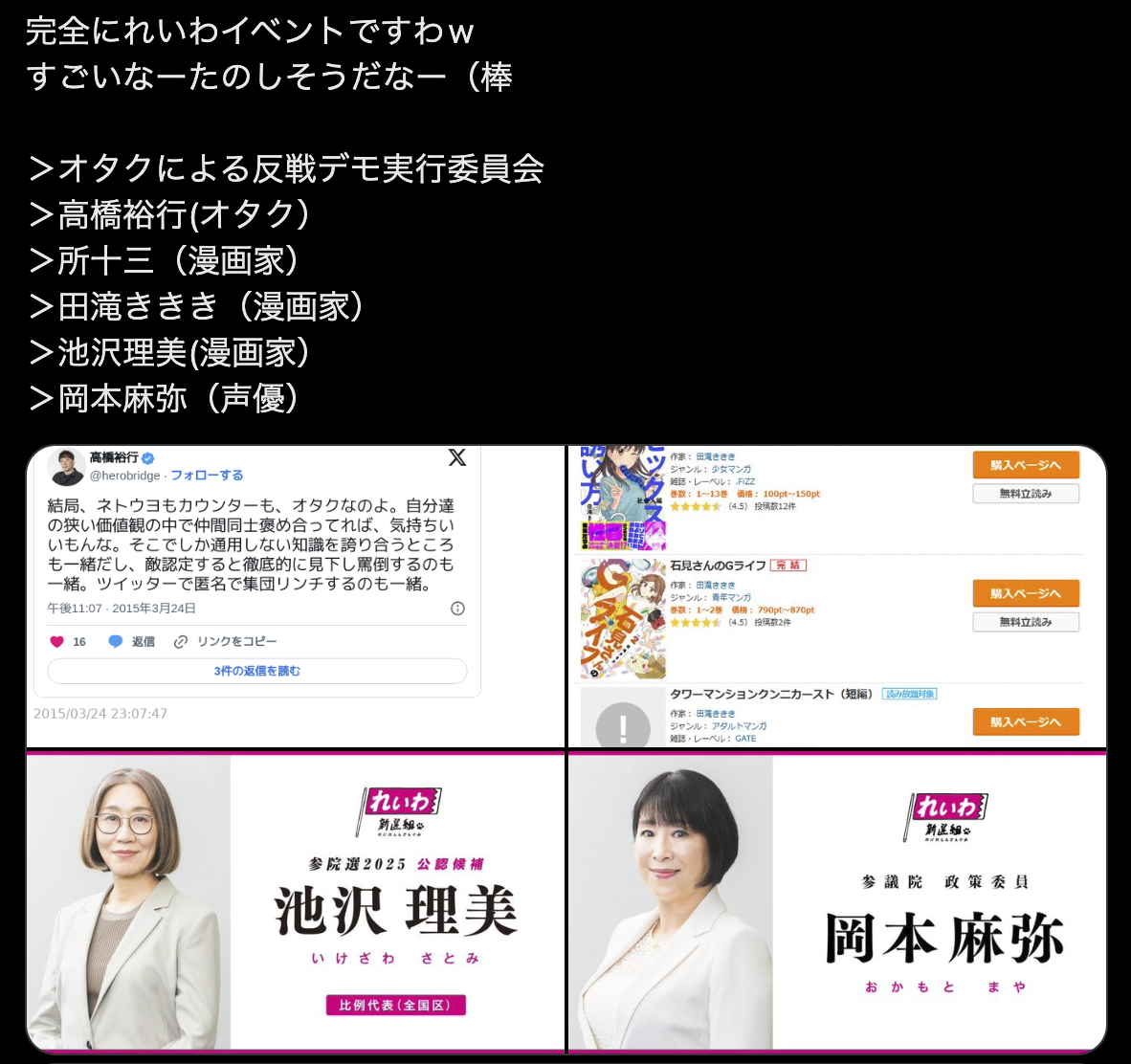 | … | 994無念Nameとしあき26/03/24(火)12:34:20No.1396009691+>頭使って物語を生み出してない声優とかアニメーターがパヨク拗らせてると余計あーあってなる |