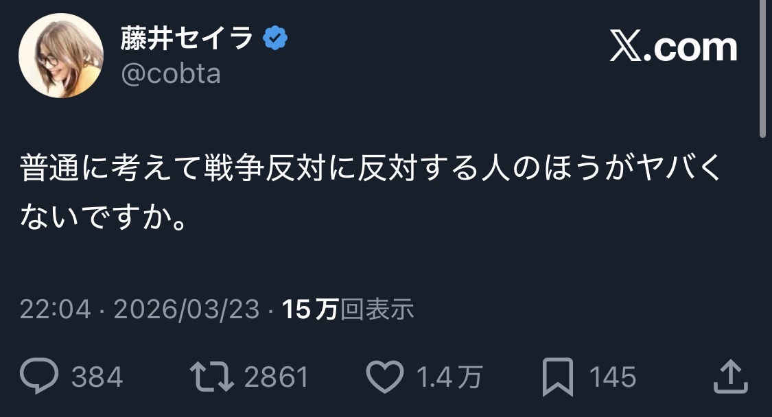 | … | 44無念Nameとしあき26/03/24(火)07:27:29No.1395976130そうだねx19ぶっちゃけ戦争賛美なんかだーれもしてないのになぁ |