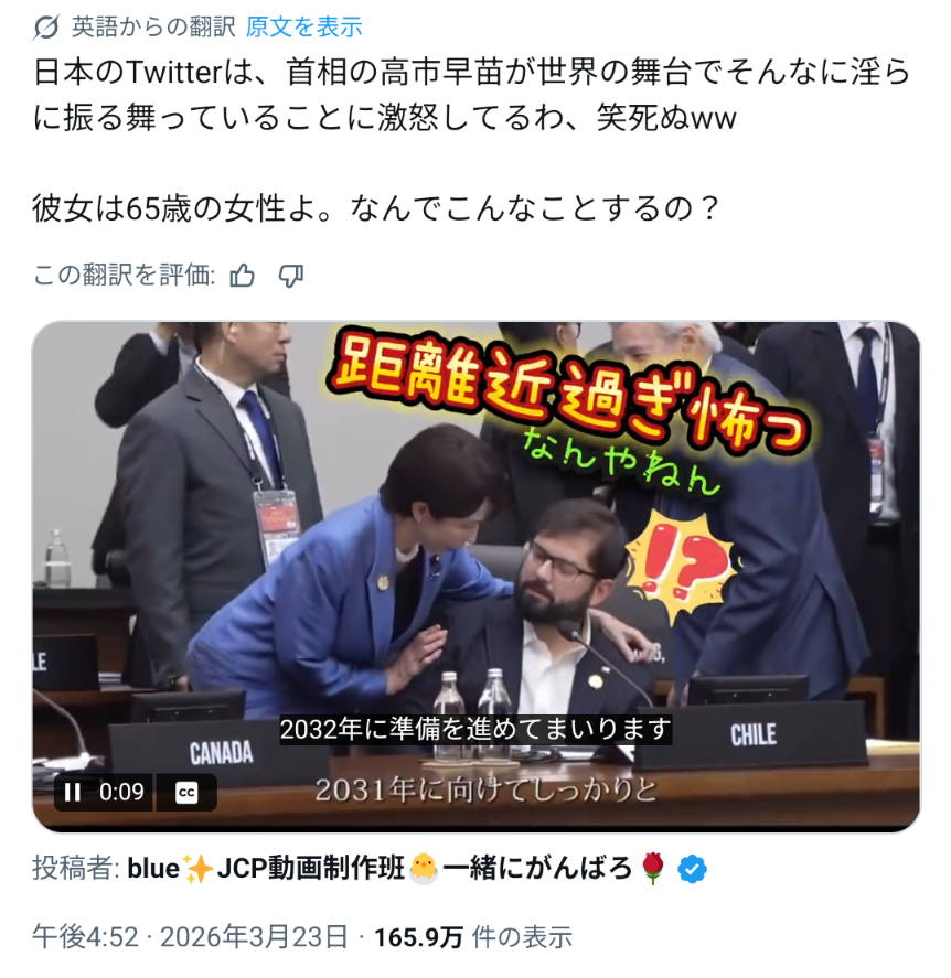 | … | 9無念Nameとしあき26/03/24(火)09:29:41No.1395987667そうだねx5 1774312181547.png-(614568 B) 高市さんのアハンウフン外交がキモすぎると話題に |