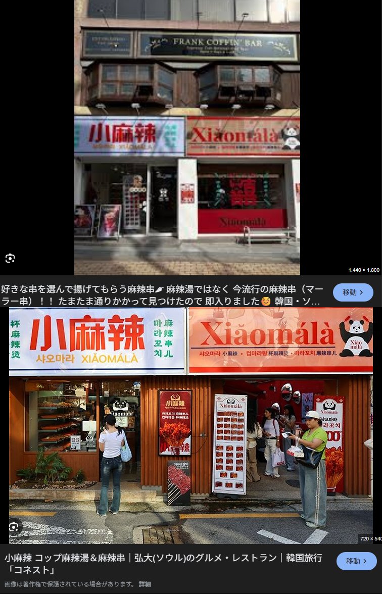 | … | 15無念Nameとしあき26/03/24(火)19:59:23No.1396083534+「小麻辣(シャオマーラー)」は、韓国で次世代トレンドとして話題の麻辣揚げ串(麻辣串 / マーラーチャン)とカップ麻辣湯の専門店です。 |