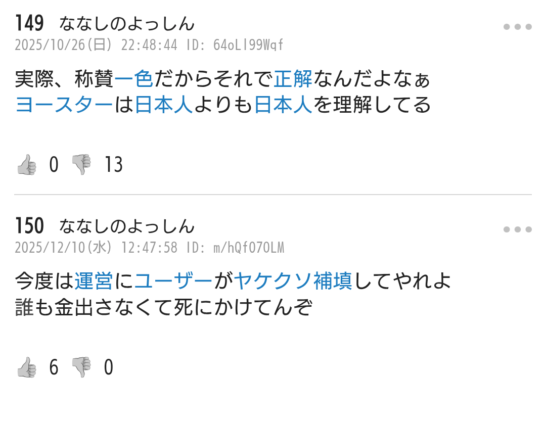 | … | 420無念Nameとしあき26/03/24(火)23:41:22No.1396146316そうだねx1>ヨースターとアズレンの記事掲示板は絶対死守する守護者わよ |