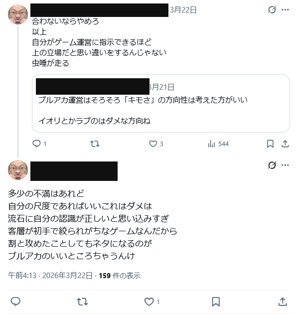 | … | 500無念Nameとしあき26/03/25(水)00:09:10No.1396152688+ 1774364950870.png-(66239 B) 全ての生徒を公平に愛するとかブルアカ界隈のエアプみたいな事を |