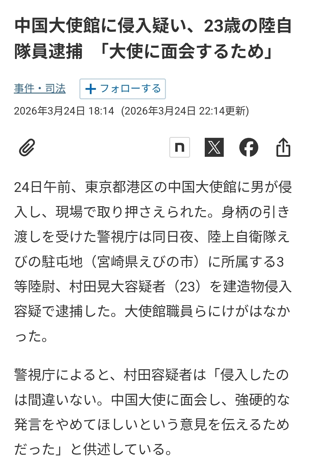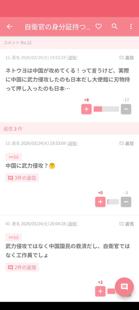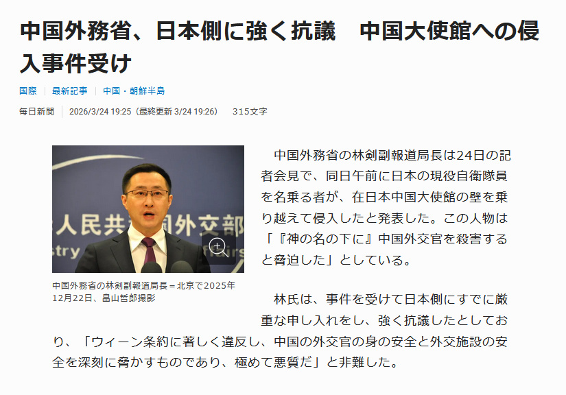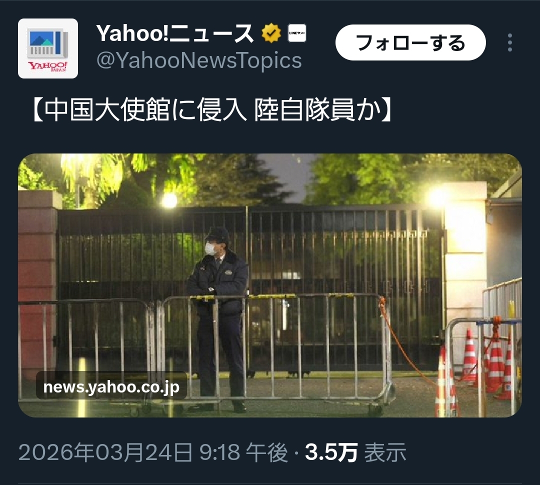 | … | 47無念Nameとしあき26/03/24(火)21:49:40No.1396115457そうだねx1>中国大使館に刃物持って侵入した自衛隊員の名前が報道されない |