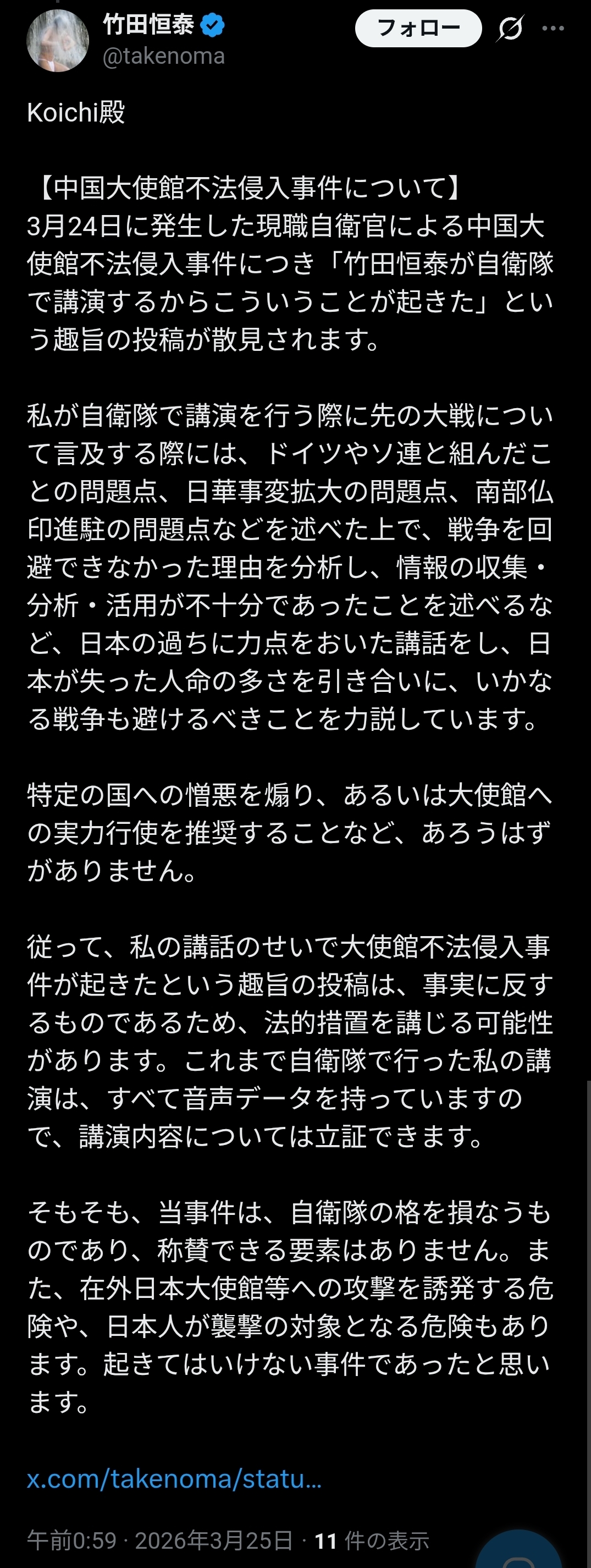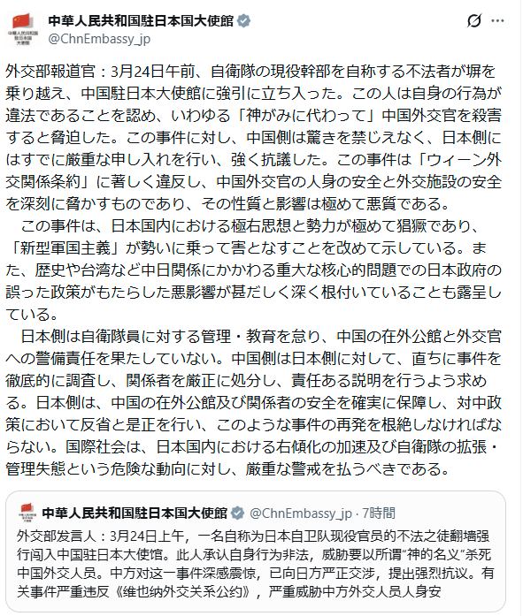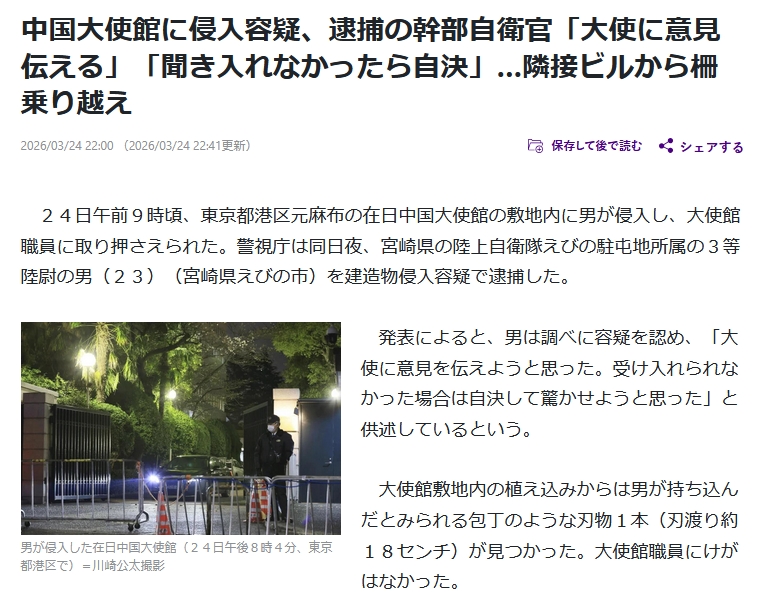 | … | 942無念Nameとしあき26/03/25(水)01:31:21No.1396168085+陸上自衛隊えびの駐屯地(宮崎県えびの市)に所属する3等陸尉、村田晃大容疑者(23)を建造物侵入容疑で逮捕。容疑者は「侵入したのは間違いない。中国大使に面会し、強硬的な発言をやめてほしいという意見を伝えるためだった」 |