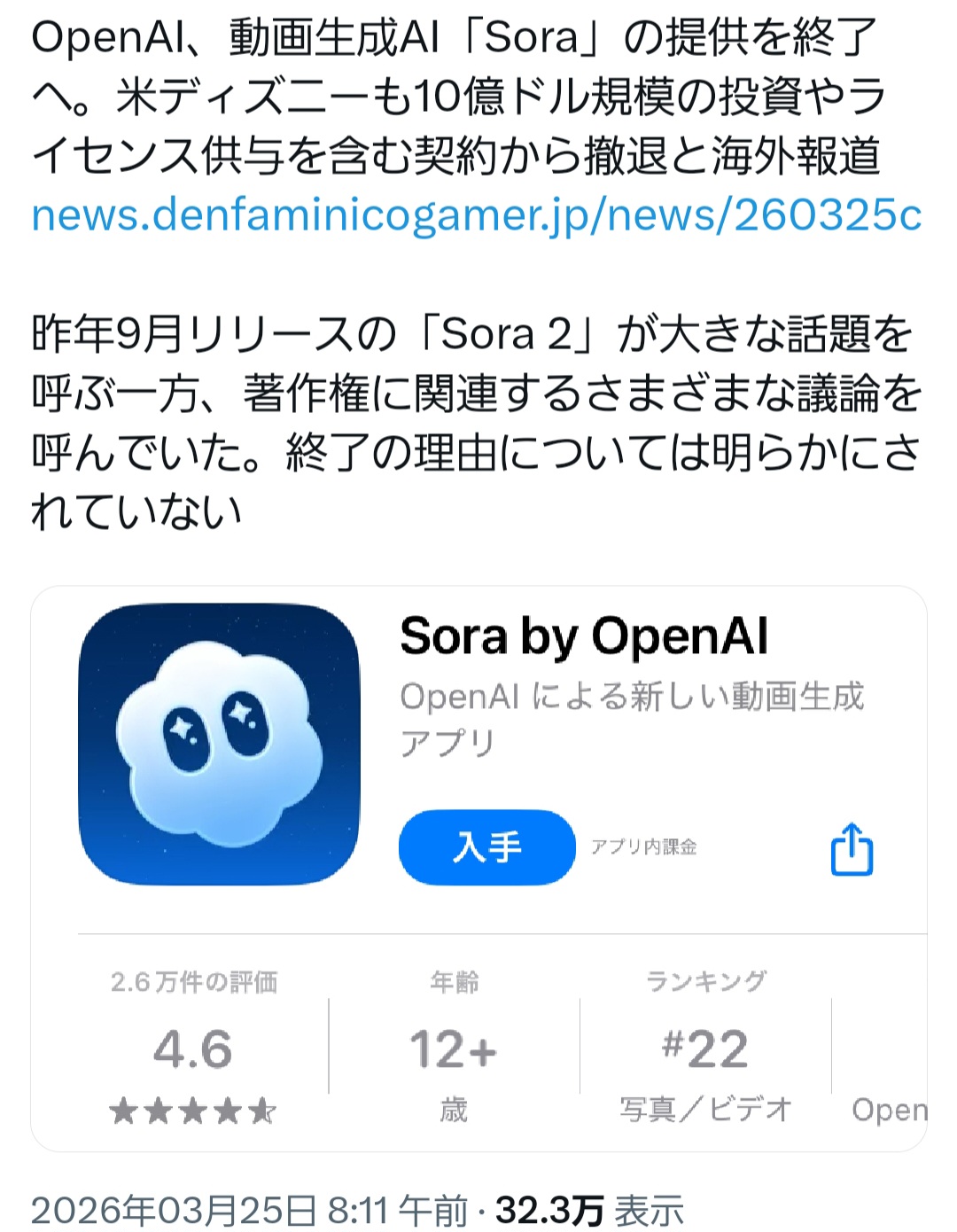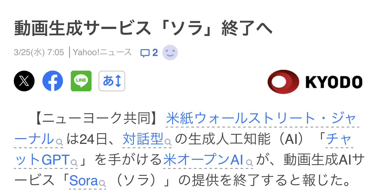 | … | 44無念Nameとしあき26/03/25(水)07:56:25No.1396191924そうだねx4>Soraが日本のアニメの著作権侵害してるって騒ぎになって集英社とかが抗議して規制したけど |