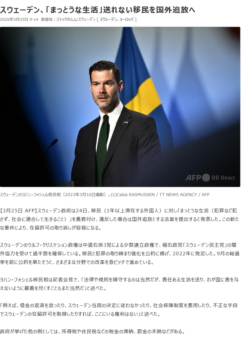| … | 346無念Nameとしあき26/03/25(水)18:59:04No.1396299352+>イスラム教徒に乗っ取られたスウェーデンが切れました |