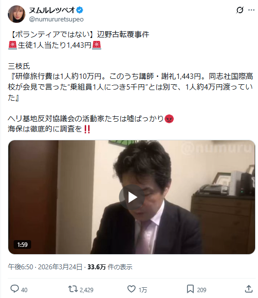 | … | 735無念Nameとしあき26/03/25(水)21:05:50No.1396332506そうだねx1辺野古沖の転覆事故 説明会で遺族が涙ながらに批判 |
