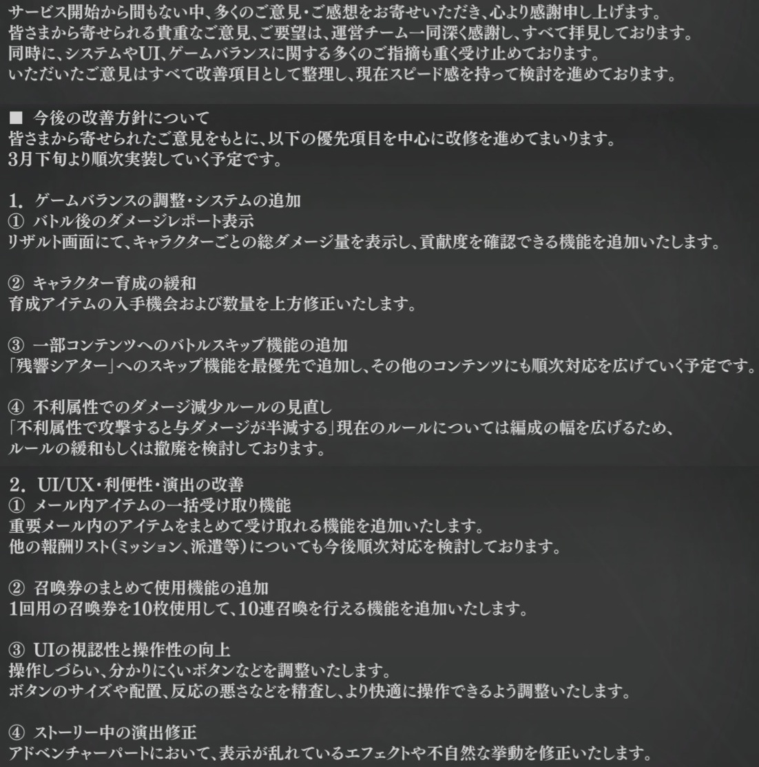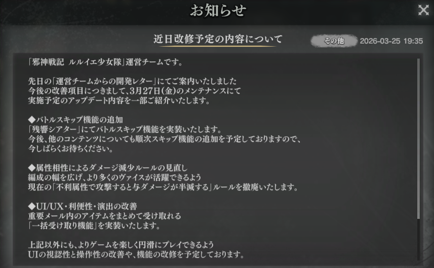 | … | 10無念Nameとしあき26/03/25(水)19:41:59No.1396309693そうだねx7>・「残響シアター」にスキップ機能を実装 |