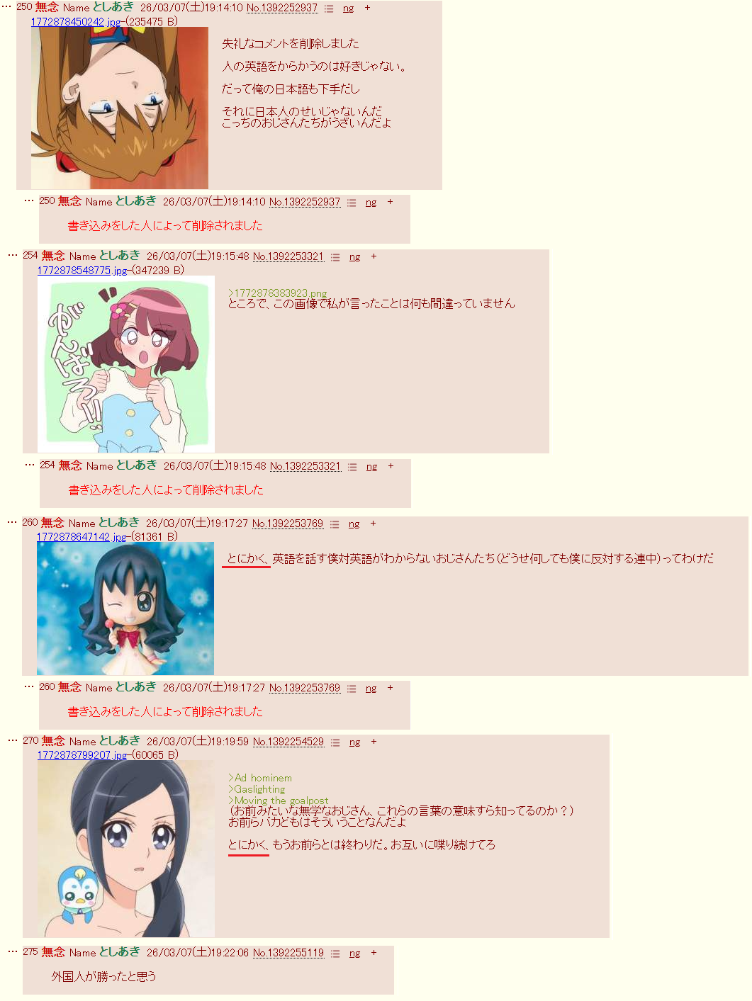 | … | 75無念Nameとしあき26/03/25(水)20:51:08No.1396328304そうだねx2>>お前らの掲示板なんて荒らされて当然だぞ、ガキ共! |