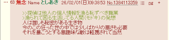 | … | 163無念Nameとしあき26/03/25(水)21:51:15No.1396344790そうだねx3>左翼のくせにタワマン住んでる糞探偵には負けねえ |