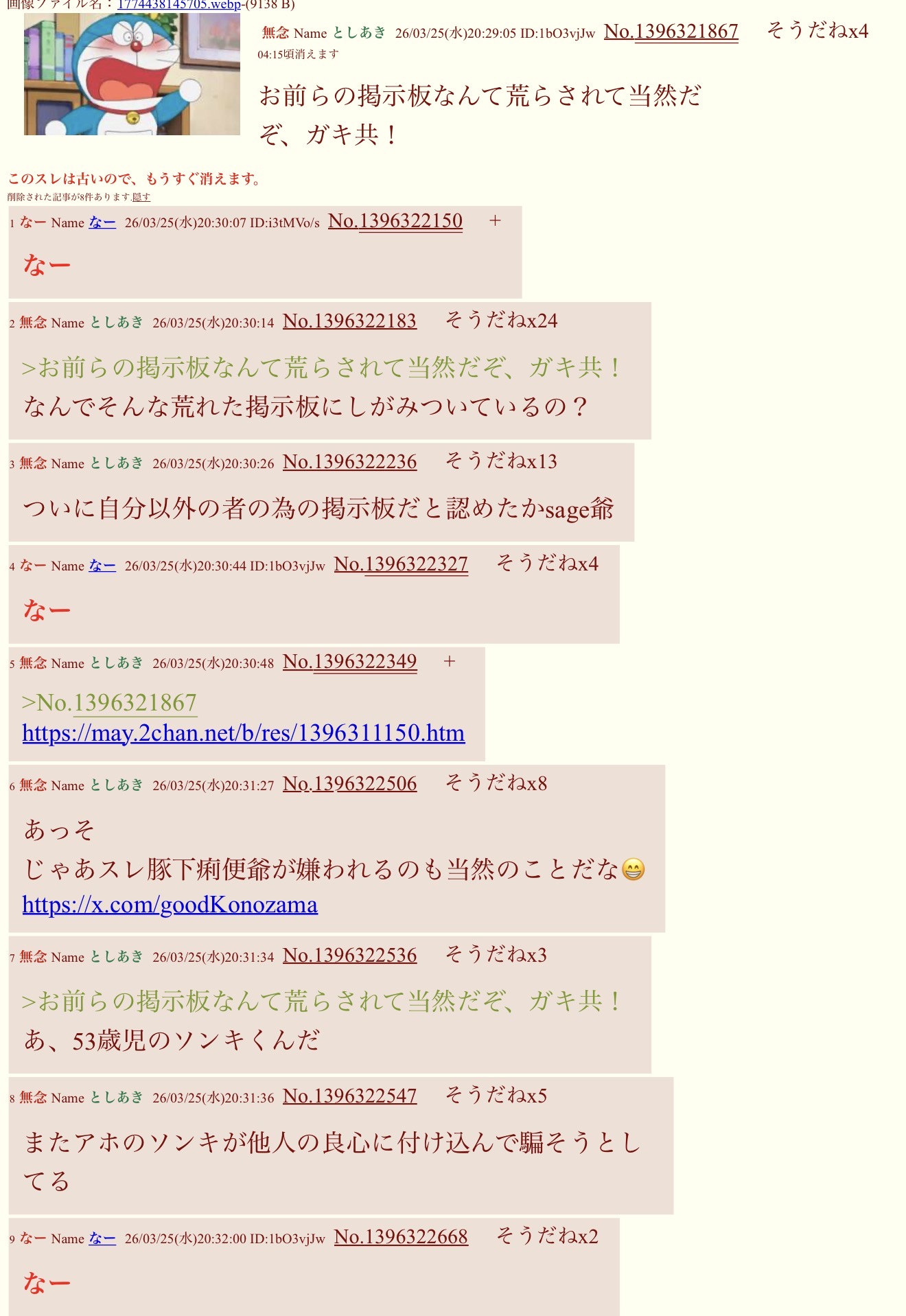 | … | 7無念Nameとしあき26/03/26(木)05:04:36No.1396396930そうだねx2>ふたば養豚場にはラリってる糞豚しか居ませんそろそろ燃やすか、、、、 |