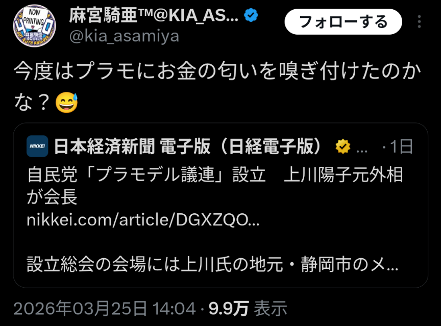 | … | 330無念Nameとしあき26/03/26(木)07:54:20No.1396405536+>石油が足りなくなるかもしれない時に自民はプラモの利権を狙ってる |
