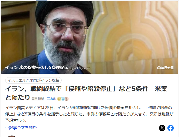 | … | 4無念Nameとしあき26/03/26(木)07:13:39No.1396402039そうだねx26停戦案あっさり拒否されたってね |