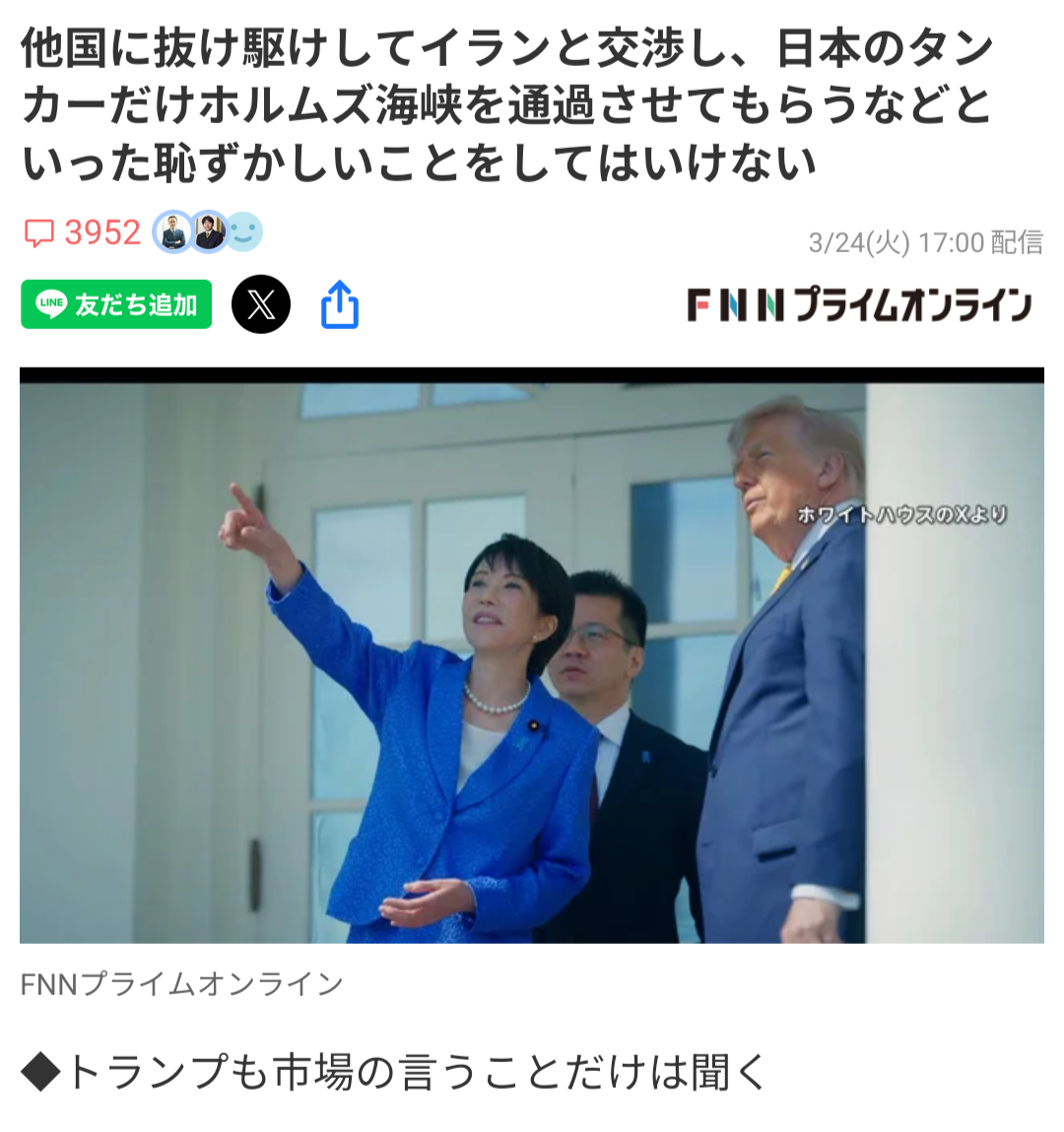 | … | 923無念Nameとしあき26/03/26(木)09:47:41No.1396417104+企業側が政府に協力求める状況が出来てるんだけど高市はまだトランプLOVE? |