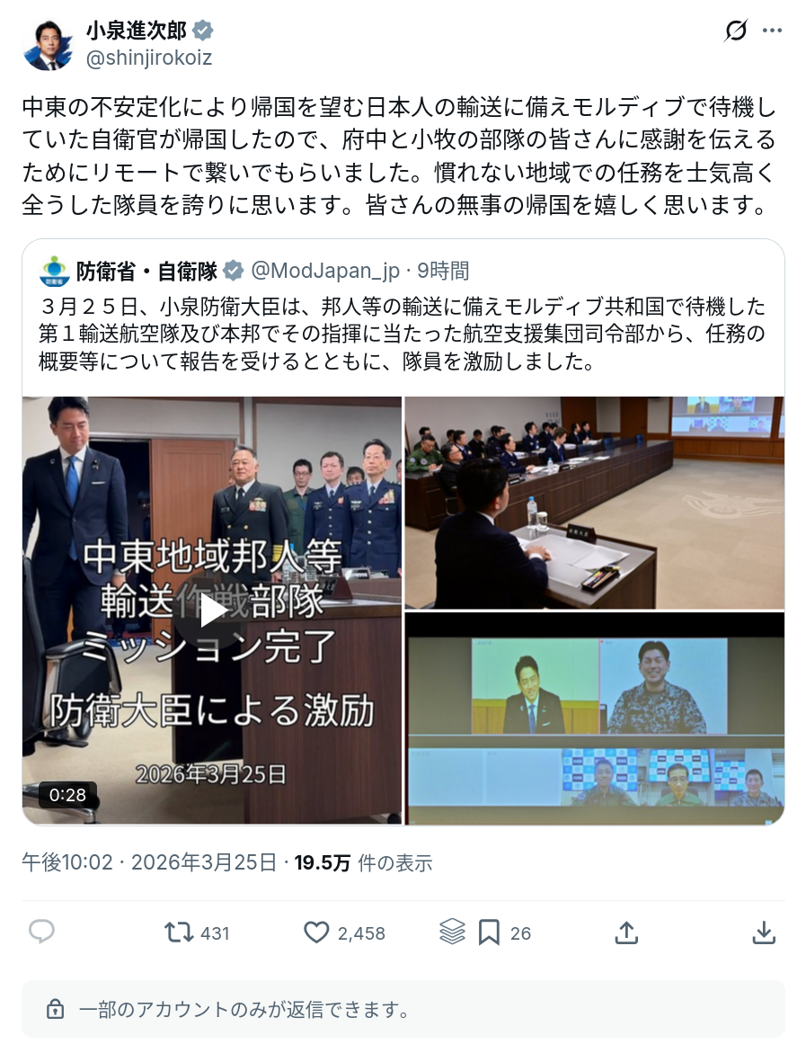 小泉防衛大臣「中東の不安定化により帰国を望む日本人の輸送に備えモルディブで待機していた自衛官が帰国したので、府中と小牧の部隊の皆さんに感謝を伝えるためにリモートで繋いでもらいました。慣れない地域での任務を士気高く全うした隊員を誇りに思います。皆さんの無事の帰国を嬉しく思います。」