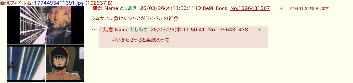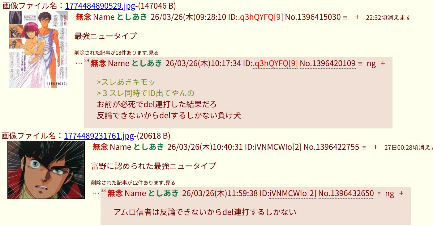 | … | 36無念Nameとしあき26/03/26(木)12:38:35No.1396439636+>アムロ信者は反論できないからdel連打するしかない |