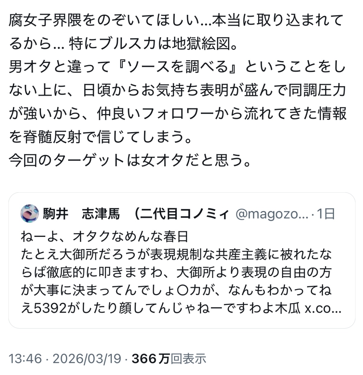 | … | 179無念Nameとしあき26/03/26(木)13:17:36No.1396446597そうだねx2 1774498656150.jpg-(973393 B) >頭悪くて承認欲求だけやたら強いタイプのオタクは左翼やカルトのカモだろうな |