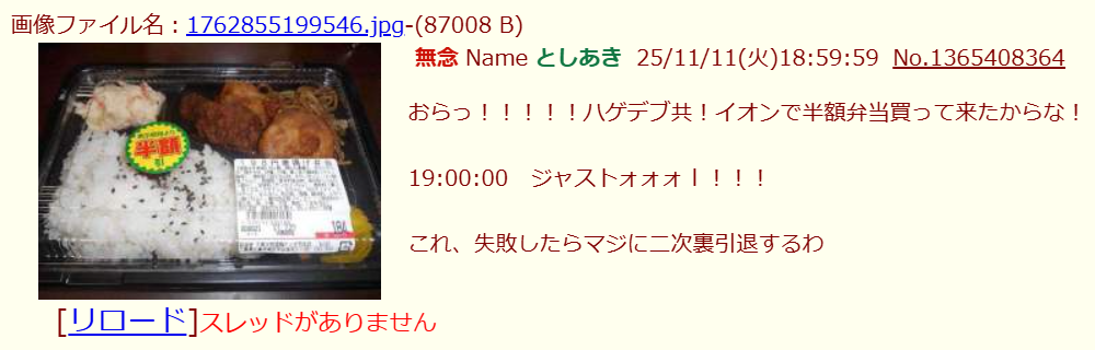 おらっ!!!!!ハゲデブ共!イオンで半額弁当買って来たからな!削除された記事が3件あります.見る