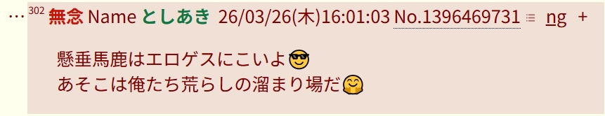 | … | 86無念Nameとしあき26/03/26(木)20:59:55No.1396527744+>荒らしはおまえだけだが? |