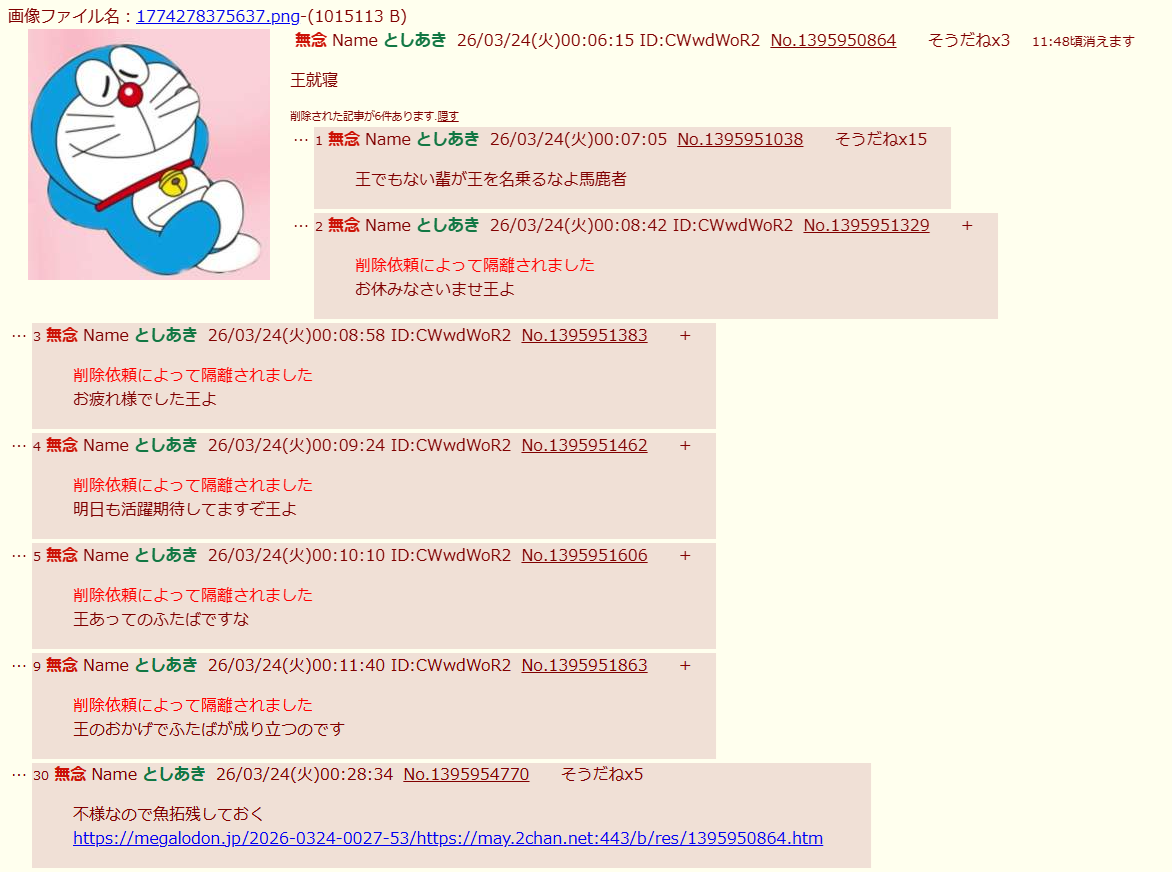 | … | 116無念Nameとしあき26/03/26(木)21:21:15No.1396533886+ 1774527675481.png-(186655 B) >昨日の無様な自演バレが恥ずかしくて消したんじゃないかな |