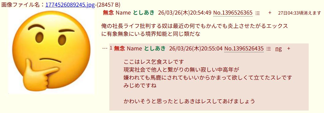 | … | 40無念Nameとしあき26/03/26(木)21:13:35No.1396531702そうだねx1はい不様 |