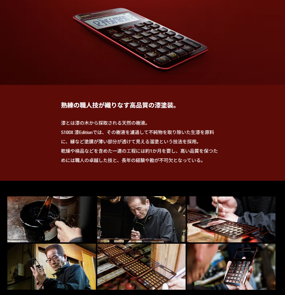 | … | 3無念Nameとしあき26/03/26(木)21:49:42No.1396542158+カシオ計算機は、日本の伝統工芸である漆塗り技術と当社電卓の最上位モデル「S100」シリーズを融合させた特別モデル『S100X-JC1-U』を4月9日に発売します。本製品は、老舗越前漆器メーカー「山久漆工(やまきゅうしっこう)」の熟練塗師が一台ずつ手作業で漆の塗装を施しており、世界限定650台の生産です。 |