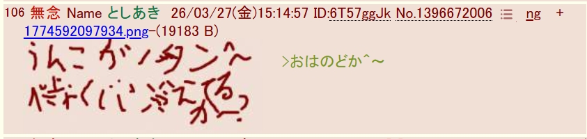 | … | 111無念Nameとしあき26/03/27(金)15:20:41 ID:I9BUiMi2No.1396672901そうだねx4>字ィ汚なっ!笑 |