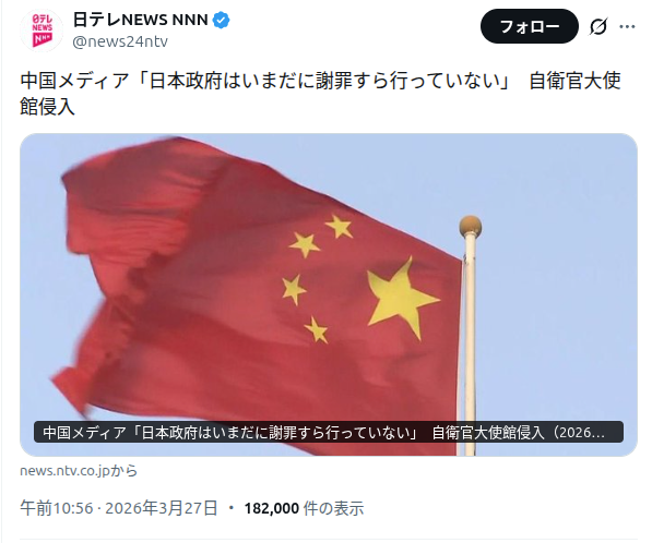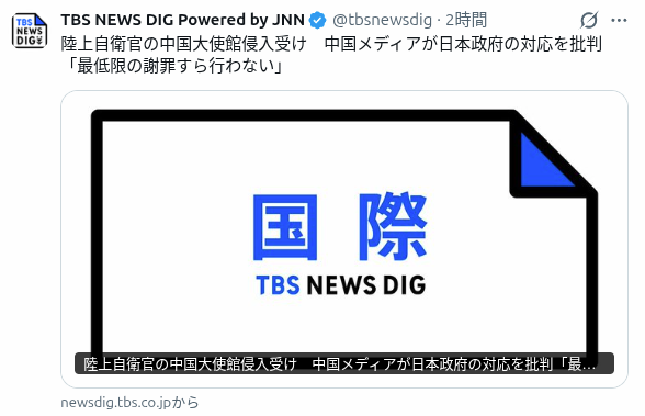 | … | 65無念Nameとしあき26/03/27(金)11:51:24No.1396637972そうだねx6中国メディア「日本政府はいまだに謝罪すら行っていない」 自衛官大使館侵入 |