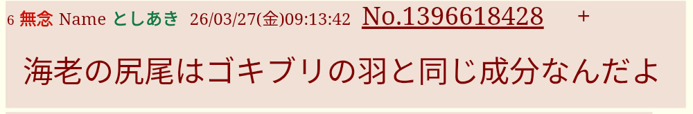 | … | 10無念Nameとしあき26/03/27(金)16:05:50No.1396680208そうだねx2>まあそれはそうとエビの尻尾は食べないほうがいいよ |