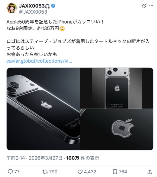 | … | 18無念Nameとしあき26/03/27(金)20:59:26No.1396749250+>Appleからジョブズの着ていたタートルネックの布切れが入ったスマホが登場 |