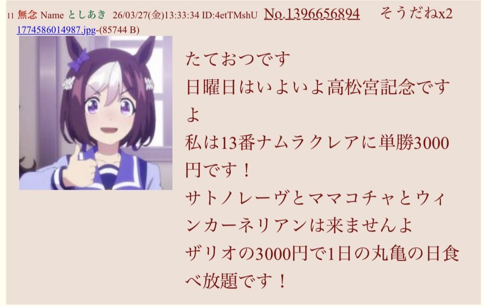 | … | 184無念Nameとしあき26/03/28(土)09:10:53 ID:U1EzNXMsNo.1396853001+モーニング競馬は中京1Rだけやろうかなーデース |