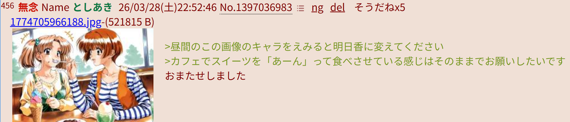 | … | 62無念Nameとしあき26/03/29(日)01:27:05No.1397070436+ 1774715225152.png-(526857 B) 前スレのカフェでスイーツを食べる二人を頂きました |