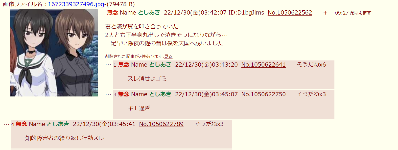 | … | 55無念Nameとしあき26/03/29(日)06:25:07No.1397092405+書き込みをした人によって削除されました |