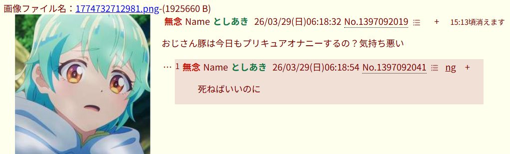 | … | 3無念Nameとしあき26/03/29(日)05:51:40No.1397090737そうだねx353歳のジジイが女児アニメ見てんじゃねーよキショいな |